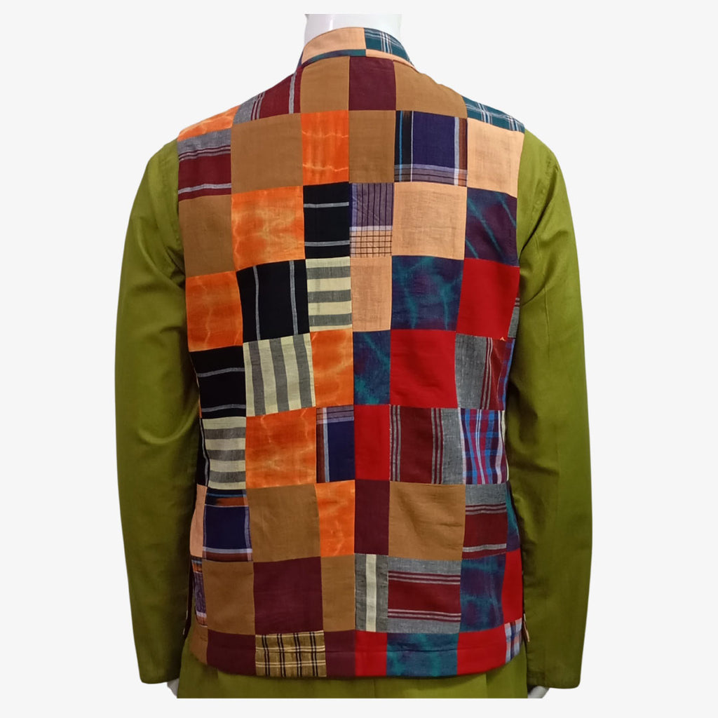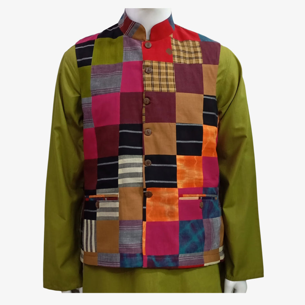 Multi Colour Patch Waist Coat. High Collar, Coconut Button, Front opening, Features two pockets in side & 2 pockets inside, Handwoven, Locally Sourced and Lightweight. Colour may be slightly differ physically than the photography or screen resolution.Delivery within 3-5 working days.
